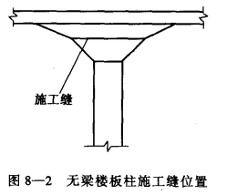 8.澆灌支律無梁樓板的柱子時,必須把施工縫留在柱腳和柱帽45°折線頂部(即柱帽折線轉折處)。柱帽上部混凝土應和樓板一次澆灌,柱帽下部混凝土應和柱子一起澆灌。見圖8-2。