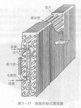 (3)蒸發器:小型空調器的蒸發器大多為直接冷卻空氣之用,稱為表面冷卻式蒸發器,如圖5-17所示。利用風機吹動空氣使之與其強迫對流。管內流動的是制冷劑,其流程一般為二進二出,管外為強迫流動的空氣,管道一般為3~4排。為了提高空氣側的放熱系數,在管道外側加裝翅片用以增加空氣側的傳熱面積,以便空氣和蒸發器形成更強烈的熱交換,以提高制冷效果。