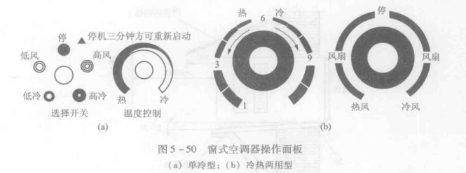 窗式空調有臥式和豎式之分,而臥式空調器又有單冷型和冷熱兩用型,因此其使用方法略有不同。單冷型空調器的控制面板上有溫度自動調節旋鈕和選擇開關,供用戶操作使用,選擇開關上面刻度有低風、高風、低冷、高冷和關(OFF)等。冷熱兩用型空調器雖有熱泵型和電熱型的分別,但其操作控制面板無明顯的區別,均有選擇器、溫度調節旋鈕及通風開關等,單冷型和冷熱兩用型空調器的操作面板如圖5-50所示。有的空調器上裝有定時器,如圖5-51所示,此定時器上有0~10h的定時擋次和連續運轉擋,使用定時器可自動控制空調器的運轉時間。鋼窗式(豎式)空調器體積較小,制冷量在2500W以內,所以只有單冷機使用比較方便,這種空調器的操作面板如圖5-52所示,上面有選擇器、定時器和溫度調節器。