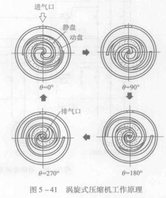 定子與機殼相固定,轉子由一個偏心距很小(4mm左右)的偏心軸帶動,繞固定盤渦旋中心以一定半徑做公轉運動,每轉一個角度,月牙形工作容積被連續壓縮一次。在圖5-41中,θ=0°時月牙形面積最大,θ=90°時被壓縮變小,θ=180°又壓縮變小,直到θ=270°~360°時氣體被壓縮到一定壓力后,從中心孔連續排出,制冷劑在外圓處壓力比較低,越到中心處壓力越高。因此,這種壓縮過程是連續進行的,且運行平穩。由于沒有吸氣閥和排氣漿,幾乎沒有余隙容積,因此,容積效率很高。渦旋式壓縮機多用在中、小型熱泵型空調器中。它與往復式和旋轉式壓縮機相比較,具有很突出的優越性能:結構簡單,運行平穩,效能比大,體積小,重量輕,噪聲低。在熱泵制熱運行時,若室外氣溫很低,則往復式和旋轉式壓縮機進、排氣壓力差顯著增大,泄漏加劇,而渦旋式壓縮機高壓區和低壓區之間隔著一個月牙型的中壓區,這就使泄漏大大減少,制熱能力得以提高,例如在環境溫度為-5℃時,渦旋式壓縮機的制熱能力約比往復式壓縮機大20%。