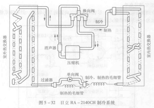 熱泵型窗式空調(diào)器的制冷系統(tǒng)如圖5-32所示。圖5-32中實(shí)線方向是制冷時(shí)制冷劑的流向,虛線方向是制熱時(shí)制冷劑的流向,依靠換向閥轉(zhuǎn)換。單向閥的作用是使制冷劑在制冷時(shí)不經(jīng)過制熱毛細(xì)管。由于制冷劑流向可以通過四通電磁換向閥轉(zhuǎn)換,因此;熱泵型空調(diào)器既可以像單冷型那樣制冷,也可以制熱。