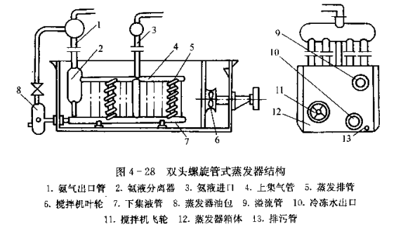 雙頭螺旋管式蒸發(fā)器的結(jié)構(gòu)如圖4-28所示,主要由蒸發(fā)器箱體、上集汽管、下集液管、氨液進(jìn)口管、氨氣出口管、氨液分離器等組成。工作時(shí),經(jīng)球閥節(jié)流降壓后的氨液,從供液總管進(jìn)入下集液管并送到各螺旋管中去,螺旋管一般由?3.5mmX38mm鋼管制成,氨液在螺旋管內(nèi)汽化吸收熱量,通過(guò)管外水箱中循環(huán)載冷劑(冷凍水或鹽水)進(jìn)行熱交換,使水箱中冷凍水溫度降低。氨氣通過(guò)上集氣管進(jìn)入液氨分離器,分離出來(lái)的液滴重新流回至下集液管,進(jìn)行循環(huán)汽化,而液氨從分離器頂部的出氣管被濟(jì)南壓縮機(jī)吸走。