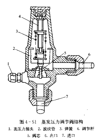 蒸發(fā)壓力調(diào)節(jié)閥的結(jié)構(gòu)如圖4-51所示,它主要由閥體、調(diào)節(jié)桿、彈簧、波紋管、閥芯和壓力表接頭組成。由蒸發(fā)器送來(lái)的制冷劑蒸氣從進(jìn)口處進(jìn)入閥內(nèi),并克服彈簧力,推動(dòng)閥芯上移,開(kāi)大閥口,制冷蒸氣經(jīng)閥的出口被壓縮機(jī)吸收,如蒸發(fā)器出口壓力升高,閥口開(kāi)大,流出的制冷劑增多,使蒸發(fā)壓力不下降;反之,若蒸發(fā)器壓力下降,則閥口關(guān)小,流出的制冷劑減小,使蒸發(fā)壓力回升。如此往復(fù),蒸發(fā)器內(nèi)的制冷劑始終保持在設(shè)定的范圍之內(nèi)。