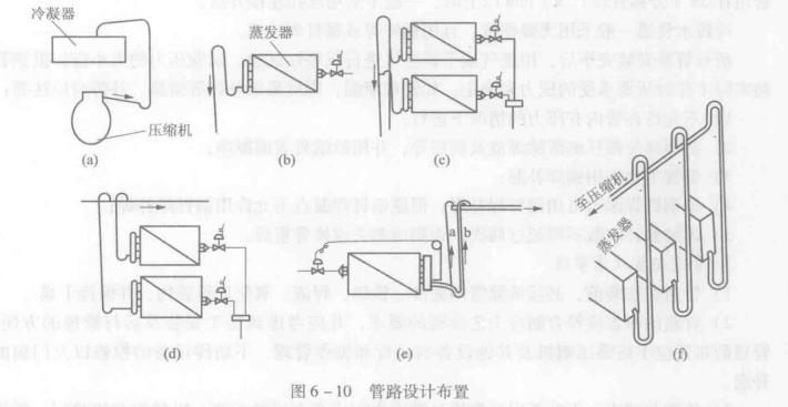 8)當蒸發器布置在壓縮機上方時,蒸發器出口處立管應設U形彎頭,如圖6-10(b)和圖6-10(ec)所示。當多臺蒸發器并聯而總回氣管又在蒸發器之上時,蒸發器回氣管應采用如圖6-10(d)所示結構。對設有調節裝置的氟利昂壓縮機回氣管,為確保壓縮機輸氣量發生變化時,既不影響豎管中垂直向上的氣流速度,又不會使管道中壓降過大,可采用雙吸氣豎管的結構,如圖6-10(e)所示。通常兩根豎管的有效截面積之和等于或稍大于單根豎管的有效截面積。在兩根豎管間用一個集油彎管連接。當制冷系統處于低負荷運行時,氣流流速較低,因而潤滑油逐漸積聚,形成油封,制冷劑蒸氣只能從a管上升,氣流流速增加,將潤滑油帶回壓縮機。如制冷機負荷增加時,氣流速度增大,破壞油封,使制冷劑從a與b管同時上升流向壓縮機,而不致使氣流速度過大,導致壓力損失過大。當多臺蒸發器并聯使用時,為了不因某一個或數個蒸發器的負荷變化而影響到其他蒸發器的正常工作,可采用如圖6-10(f)所示的連接方法。