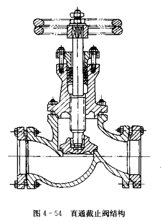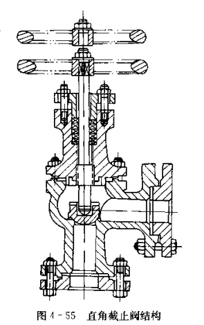 截止閥的形式有直通閥和角閥兩種。如圖4-54所示為直通截止閥如圖4-55所示為濟(jì)南生產(chǎn)的直角截止閥。兩種閥的外形不同,但結(jié)構(gòu)差不多,都是由手輪、壓圈、填料蓋、填料、閥蓋、閥桿、閥體、閥芯等部件組成。在閥芯上和閥背未均鑲有一圈軸承合金,可起到關(guān)的作用。