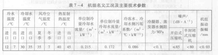 3、活塞式冷水機組的名義工況及主要技術參數見表7-4。