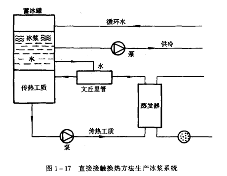 蓄冰技術(shù)采用的制冷形式主要有:管內(nèi)、外蓄冰、密封件蓄冰罐的靜態(tài)制冰和冰收獲器、接觸式制冰漿機的動態(tài)制冰。圖1-17表示的是利用直接接觸換熱方法生產(chǎn)冰漿的系統(tǒng)。