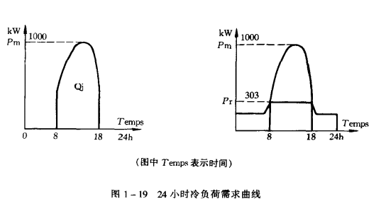 建筑物之空調(diào)負荷分布是極不均勻的,以辦公大樓為例,圖1-19給出其24小時的冷負荷需求曲線。圖中縱軸為冷負荷需求。顯然,8:00~12:00,14:00~18:00為上班時間,其它時間基本為關(guān)機時間,采用傳統(tǒng)的空調(diào)系統(tǒng),制冷機組的配置必須滿足峰值負荷的要求,即Pm=1000kW。而采用蓄冷系統(tǒng),則可充分利用時間,即時效由10小時伸延至24小時,裝機容量也相應(yīng)降至Pr=300kW。