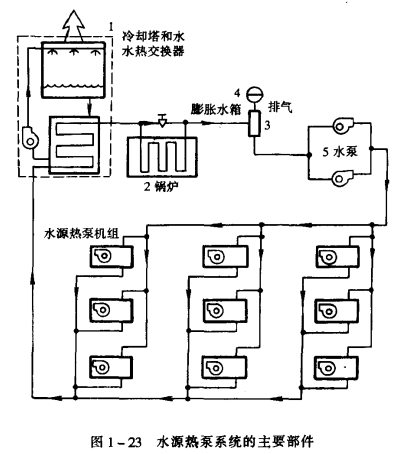 水源熱泵系統的主要部件見圖1-23。水源熱泵系統見圖1-24。