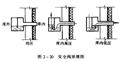 在氣調(diào)庫(kù)密閉后,保證庫(kù)內(nèi)外壓力平衡的安全閥也是氣調(diào)庫(kù)必不可少的特有安全設(shè)施。安全閥可以防止庫(kù)內(nèi)產(chǎn)生過(guò)大的正壓和負(fù)壓,使圍護(hù)結(jié)構(gòu)及其氣密層免遭破壞。安全閥是利用水封原理制成的,其原理如圖2-20所示。