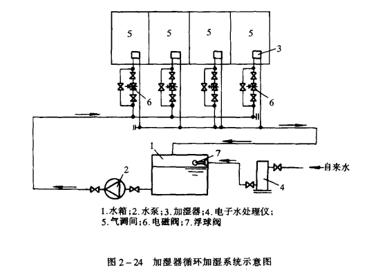 圖2一24為氣調(diào)庫(kù)內(nèi)加濕器循環(huán)加濕系統(tǒng)示意圖。在玻璃鋼水箱旁安裝一臺(tái)水泵,水泵由高壓塑料軟管與各個(gè)氣調(diào)間內(nèi)加濕器相連接,加濕器溢流回水管接至水箱,如此往復(fù)循環(huán),即可達(dá)到庫(kù)內(nèi)加濕的目的。各個(gè)氣調(diào)間的加濕通過(guò)庫(kù)內(nèi)濕度傳感器自動(dòng)控制電磁閥的啟閉。