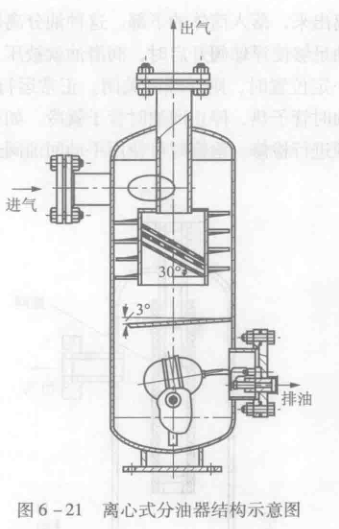 離心式油分離器結構如圖6-21所示。在分離器的內部焊有螺旋狀的導向葉片;并在器內中間進氣管的底部裝設有多和孔擋液板。壓縮機的排氣進入分離器后,沿導向葉片呈螺旋狀運動。由于離心力的作用,其中攜帶的潤滑油被甩至簡體內壁,并沿簡壁流到分離器底部,而蒸氣則經多孔擋液板再次分油后,從出氣管排出。有的離心式油分離器外部還設有水套,用水來冷卻,其目的是提高分離油的效率。