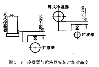 (3)貯液器。貯液器的安裝與臥式冷凝器相同,根據使用的具體情況,貯液器可以不用地腳螺絲而直接放在支座上。冷凝器和貯液器安裝時的相對高度,如圖5-2所示。其相對高度應予保證,使冷凝后的制冷劑液體靠重力流入貯液器的可能性。