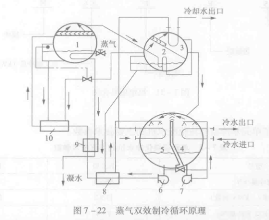 制冷循環過程:由熱源(蒸汽、熱水或油、天然氣、煤氣等燃料)將溴化鋰稀溶液進行加熱濃縮(在高壓發生器中進行),溴化鋰溶液沸騰,濃縮了溴化鋰溶液經高溫熱交換器后進入低溫發生器,被由高溫發生器產生的冷劑蒸氣進一步加熱濃縮,濃縮了的溴化鋰溶液經低溫熱交換器降溫后進入吸收器,吸收來自蒸發器中的冷劑蒸氣而又變成稀溶液,稀溶液經泵打入低溫熱交換器、凝結水換熱器、高溫熱交換器返回發生器進行溶液循環。由高壓發生器分離出的冷劑蒸氣經低壓發生器,與來自發生器的濃溶液在低壓發生器中進一步被加熱濃縮分離出的冷劑蒸氣一起進入冷凝器冷卻變成冷劑水,經減壓后進入蒸發器,吸收蒸發器管內的熱量,使冷水溫度降低,供用戶使用。圖7-22所示為蒸氣雙效制冷循環原理。