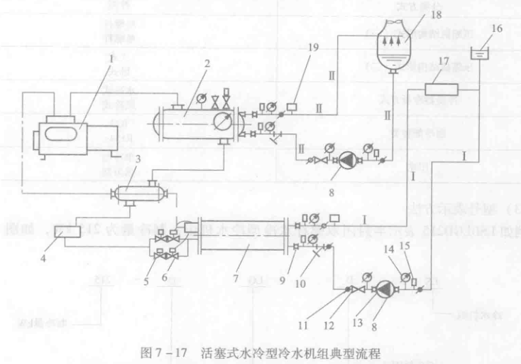 如圖7-17所示,蒸發器為干式殼管式,傳熱管采用內外帶翅片的高效傳熱管,R22在管內氣化,冷水在管外被冷卻。為保證壓縮機的干壓行程,機組中設有氣液熱交換器3。低壓氣氟利昂氣體進入壓縮機1,經壓縮后,進入冷凝器2,蒸汽冷凝成液體,進入氣液熱交換器3中,被來自蒸發器的低壓燕汽進一步過冷,過冷后的液體經干燥過濾器4、電磁閥5,并在熱力膨脹閣6內節流到燕發壓力后進入蒸發器,R22液體在干式蒸發器7內氣化,吸收冷水的熱量后,經氣液熱交換器3,被來自冷凝器的高溫液體加熱,重新進入壓縮機,如此不斷循環。