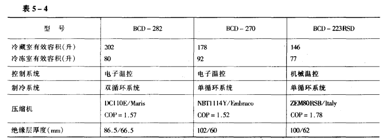 單循環和雙循環制冷電冰箱的區別為了便于說明單循環和雙循環制冷系統在溫度控制以及節能方面的區別,我們以結構、系統相近,具有可比性的3種冰箱的測試數據為依據進行了分析。表5-4為3種冰箱的主要結構參數。3種節能冰箱在不同環境溫度下的溫度分布見表5-5。
