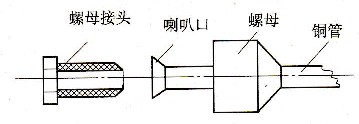 (1)喇叭口連接:將管口支喇叭口(也稱擴口)用接頭和接扣以螺紋擰緊鎖死的形式,使兩管端連接起來,其結構如圖1-11所示。支喇叭口的操作方法:用割刀切斷管子,用中齒銼銼平管口,去除管內外的毛刺,同時防止灰塵及金屬屑進入管內,套上接口,然后用擴口器支喇叭口,喇叭口表面應光潔、無傷痕,更不允許有有裂縫存在。喇叭口的高度應適中,其高度約為0.4d(d為銅管的外徑),過低會使喇叭口的密封面積小,密封性差,容易泄漏;過高時喇叭口的外徑會大于接口的螺紋內徑,使接口套不進去。喇叭口連接的特點是加工方便,只要將喇叭口加工好,其密封質量還是不錯的。在沒有激烈震動的情況下,它的使用壽命也比較長。它一般用于管徑為20mm以下的銅管連接。