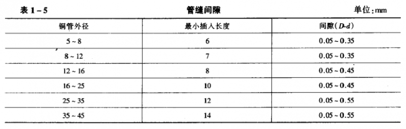 (2)釬焊連接:將一根銅管的管口的一段擠脹大后,另一根銅管插入脹大管口內,用釬焊加以緊固和密封。插入管子間的接縫間隙的大小,對連接部位的強度有相當大的影響。間隙過小,焊料不能完全滲入間隙內,降低了其拉伸強度,而且也容易泄漏。間隙過大,焊料容易滲入管內堵塞管子,旦浪費焊料。不同尺寸的鋼管的管穎間隙(D-d)以及管子插和深度列于表1-5,供參考。另外,也有含銀量較低的銀銅合金焊料,有含銀量為15%焊條,其熔點為641℃,流動點為704℃。有含銀量為5%低銀焊條,其熔點為646℃,流動點為704℃。