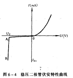 穩(wěn)壓二極管是一種用特殊工藝制造的面結(jié)型半導(dǎo)體二極管,外形和普通二極管沒(méi)有什么區(qū)別。穩(wěn)壓管的伏安特性如圖6-4所示。