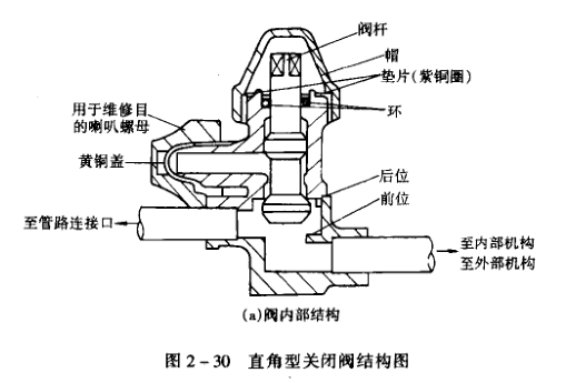 關閉閥的型式很多,目前用得比較多的是直角型關閉閥,即進、出口成水平方向,2-30所示。關閉閥有三個向外連通的孔,兩個孔與進、出接管相連接,另一個小孔通孔,供系統運行時操作用,如抽真空、充制冷劑、裝壓力表等等,不用時應將閥頭閉的開關情況是:當閥心向下關足時,閥門為關閉狀態,而旁通孔則是打開的;當閥心時,閥門被開足,旁通孔是關閉的;當閥心處在上下之間時,閥門通。