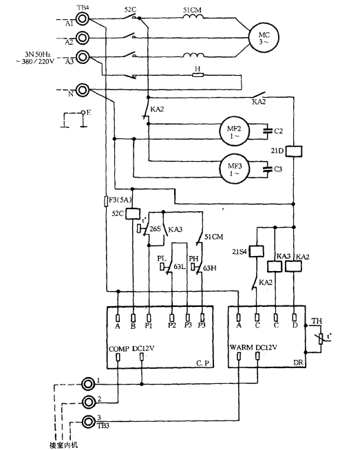 工作過程如下:當室內機發出制冷信號時,室外機TB3端子將12V直流電送到C.P.板,此時通過內部繼電器使端子A與端子P2相聯。這樣從TB4的A1端經F3(5A)→A端→P2端→低壓開關63L→高壓開關63H→壓縮機過流繼電器51CM→熱控開關26S→PI端→B端,使交流接觸器52C得電動作,52C常開觸點閉合,三相電經過流繼電器使壓縮機得電工作,同時經KA2常閉觸點使室外風機MF2 ,MF3工作。