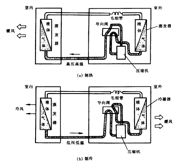 另外,空調器不但能制冷,帶有熱泵裝置和電加熱裝置的空調器還能制熱,其中采用熱泵裝置的不是用電加熱器加熱,而是通過制冷系統的反向循環,把室外熱量吸進室內,增加室內熱量。熱泵空調器是單冷空調器的派生產品,它們之間的主要區別是:在制冷系統中裝上一套四通導向閥(又稱換向閥),通過導向閣的切換導向,改變制冷劑的流動方向,空調器就能制熱。圖2-20是熱泵空調器的工作原理示意圖。當導向閥切換導向后,壓縮機排出的高溫制冷劑蒸氣流向室內蒸發器中放熱,變蒸發器為冷凝器,將熱量向室內排放,然后通過毛細管節流降壓,在室外機組的冷凝器中蒸發吸熱,變冷凝器為蒸發器以吸收室外空氣中的熱量。熱泵空調器就是這樣吸收室外空氣熱量,向室內空氣環境排放。它比單純用電加熱器制熱,節電、快速、安全,且室內溫度分布均勻,特別適應于南方地區使用。