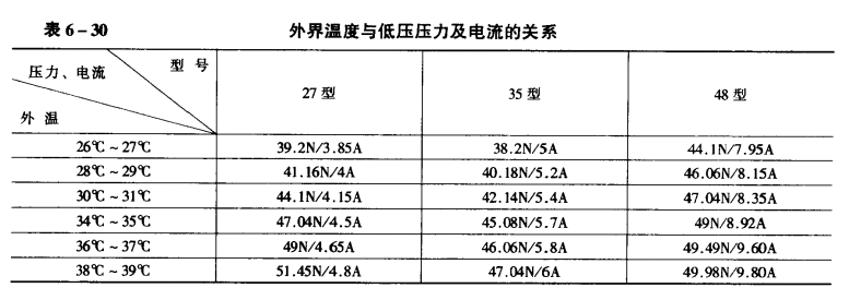 其他問題 ①空調器前后有障礙物,影響空氣流動,降低熱交換,從而使空調器的制冷量下降。②房間內溫度過高或過低、超過空調所允許的使用溫度范圍。③空調器房間密封不嚴,進排風門未關閉,室內人員進出頻繁。④室內使用發熱器具,陽光直接照射空調器,環境溫度大于43℃。⑤冷凝器進風口與出風口的散熱效率急劇下降,造成制冷劑的冷凝溫度和壓力上升,甚至超過壓縮機的實際負荷,由于節流狀態改變,而蒸發面積是一定的,吸氣溫度提高,在這種惡性循環狀況下,會出現壓縮機斷續啟停、或抖動停止現象。⑥空調器房間的面積太大或室內高度過高,而空調器的規格制冷量太小。外界溫度與低壓壓力及電流的關系如表6-30所示。