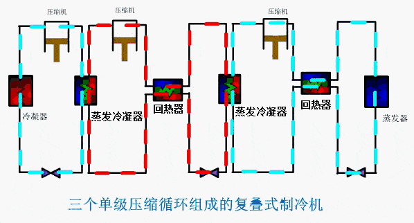 由于上述種種原因,要想達(dá)到更低的沮度,采用單一制冷劑的多級壓縮制冷循環(huán)是不利的,或者說是不可能的。在一般情況下,當(dāng)蒸發(fā)溫度在-80℃以下時,就需要應(yīng)用復(fù)疊式制冷裝置或其他形式的制冷機。