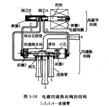 電磁四通換向閥由四通換向閥和電磁導(dǎo)向閥兩部分組成,二者之間用三根導(dǎo)向毛細(xì)管連接。其結(jié)構(gòu)如圖3-58所示。從圖中可以看出,電磁導(dǎo)向閥由閥芯、彈簧、銜鐵和電磁線圈等組成,閥體上開有三個連接導(dǎo)向毛細(xì)管的閥孔。
