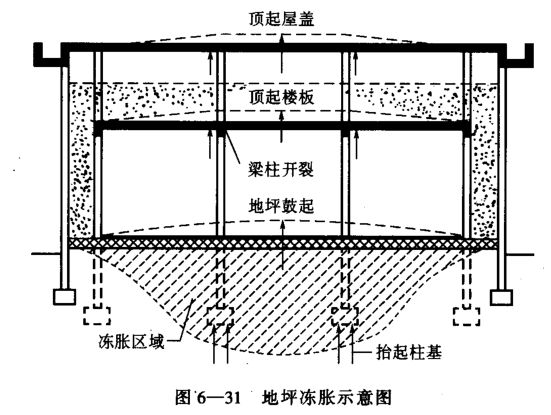 土壤的凍結與土壤的結構和地下水位的高低有關。巖石不會凍脹;砂質土因空隙較大,水分易滲入下面的土壤中,而下面土壤中的水分又因和毛細管作用弱而很難上升,故這類土壤也不會產生凍脹。但細質土壤如黏土、亞黏土、灘泥等,水分與土壤質點處于融合狀態。當0℃等溫線越過隔熱層侵入土壤后,土壤中的水分便凍結。由于凍結土壤周圍的水蒸氣分壓力比尚未凍結的土壤中的水蒸氣分壓力低,因而促使未凍的水分通過毛細管作用移向已凍結的土壤。于是,土壤越凍越深,越凍越快。最后凍土深度,超過基礎的底面,往往會把基礎項起,造成上部結構的破壞。