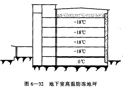 (1)地下室防凍:將不會引起土壤凍結的高溫庫布置在低溫庫的底層。這是目前大中型多層冷庫普遍采用的一種方法,適用于地下水位較低的地區。地下室構造簡單,只做一般防水處理即可。但在地下水位較高的地區,地下室的防水處理比較復雜,投資大,而且難以保證,不宣采用。參見圖6-32。