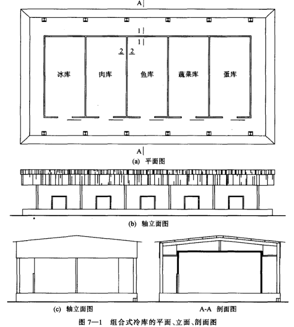 (一)室外組合式冷庫:一般以鋼結(jié)構(gòu)框架為主體框架,按建筑結(jié)構(gòu)施工圖紙施工冷庫基礎(chǔ),進(jìn)行基坑的開挖,土建隔熱地坪的施工,在地面工程完成后,即可用預(yù)制好的工字鋼或模鋼作為立柱和主、次梁進(jìn)行焊接組合,并用鋼筋和花籃果栓拉結(jié)牢固,安裝成冷庫外圍鋼結(jié)構(gòu)框架,在框架頂部鋪以瓦楞形鋼板作為頂棚屋面并作防水處理。主體框架完成后,在棚式框架內(nèi)進(jìn)行預(yù)制庫板的安裝,吊裝庫板于鋼結(jié)構(gòu)框架上固定,形成庫房的墻板和頂板,按設(shè)計(jì)要求組合成一定容量的冷庫。圖7-1為某一室外組合式冷庫的平面、立面、剖面圖。