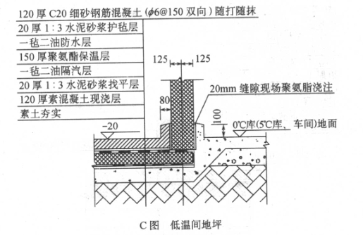 室外組合式冷庫:按建筑結構施工圖紙施工冷庫基礎,首先是開挖基坑,素土夯實,做素混凝土墊層后,從下往上其構造層依次為:墊松散材料(如:砂或爐渣等)并預埋通風管道(低溫庫);鋪素混凝土磚并用水泥砂漿找平;油秸隔汽層;聚氨脂或軟木隔熱層;油秸隔汽層;鋼筋混凝土荷載層并作水泥砂漿面層(做好鋼結構框架頂埋件)作為室外組合式冷庫地坪。圖7-4的A、B、C、D圖為組合式冷庫的凍結間高溫間和低溫間的地坪做法。