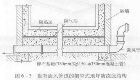 架空層進風口宜面向當地夏季最大頻率風向,圖6-3所示為地坪下設通風管進行自然或機械通風的地坪防凍脹結構。另外,當采用預熱式地坪防凍脹時,其機械送風溫度取10℃,熱液溫度為15℃,排風或回液取5℃。通風水泥管宜取Ф250~Ф300mm,無縫鋼管取Ф38~Ф57mm。載熱液體須經過慮后送入,加熱管應設在地坪隔熱層下的混凝土墊層內,并采用鋼筋網將加熱管固定,金屬加熱管須采用焊接連接,混凝土施工前應作表面0.6MPa/24h的校樓試驗。