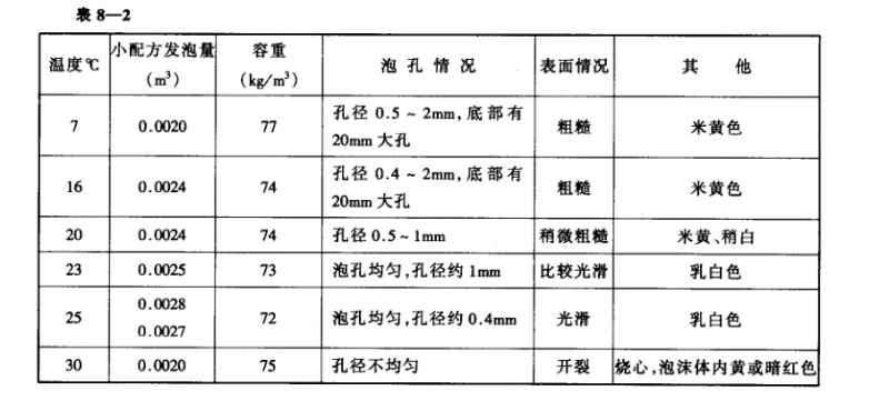 按配方將羥值在500mg(KOH)/g左右的多羥基化合物和交聯劑、催化劑、發泡劑、泡沫穩定劑、阻燃劑等正確稱量,均勻混合置于甲組料容器中,將異氰酸脂置于乙組料容器中,如溫度過低,全部物料須在水浴中加熱調整溫度(溫度過高則降溫),然后甲乙兩組料由機械混合后注入模內發泡成型,甲組混合料每次灌注稱量須根據模板的具體情況而定,一般控制在1~2公斤范圍內,以每次1公斤較好,以免料層過厚影響散熱。物料的施工溫度以25℃為最好,所形成的泡沫體為乳白色,氣泡均勻、密實,表面光滑,孔經約0.4毫米,取5x5厘米試件測定其容重為72kg/m3。物料在不同施工溫度時的效果比較見表8-2。