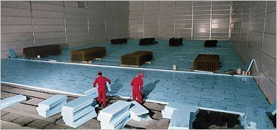 如某500噸冷庫地坪用爐酒隔熱,由于通風面狹窄,通風道通風不良,加上生產使用管理欠善,投產使用4年的地坪凍鼓20厘米,通風道中部溫度下降到-2℃,地坪和內雯裂,隔墻傾斜,冷庫門關閉不嚴。維修過程中,在室外設置焦炭爐,用風管和鼓風機把熱空氣送入地下通風管并保持在20℃左右,在兩周時間內,地坪基本恢復了原狀,經修補地坪裂縫及上部結構冷庫即可繼續生產。