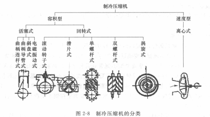 制冷壓縮機是蒸氣壓縮式制冷系統(tǒng)中最主要的設(shè)備,是壓縮制冷循環(huán)系統(tǒng)的“心臟”。制冷壓縮機的形式很多,根據(jù)工作原理的不同,可分為容積式制冷壓縮機和離心式制冷壓縮機兩大類,如圖2-8所示。容積式制冷壓縮機是靠改變工作腔的容積,將周期性吸入的定量氣體壓縮來提高氣體壓力。常用的容積式制冷壓縮機有往復(fù)活塞式制冷壓縮機和回轉(zhuǎn)式制冷壓縮機。回轉(zhuǎn)式制冷壓縮機是靠回轉(zhuǎn)體的旋轉(zhuǎn)運動替代活塞式壓縮機中的活塞的往復(fù)運動,以改變氣缸的工作容積,從而將一定數(shù)量的低壓氣態(tài)制冷劑進行壓縮。活塞式壓縮機屬于往復(fù)式,螺桿式壓縮機、旋轉(zhuǎn)式壓縮機以及渦旋式壓縮機屬于回轉(zhuǎn)式。