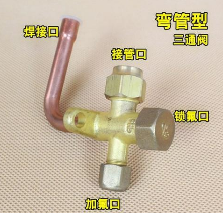 三通閥檢修口為公制,并且帶頂針。閥芯使用一字旋桿(手鉗)開啟或關閉,活動范圍只有180°,處于水平位置時為正常使用的開啟狀態,位于垂直位置時為移機(或收氟)的關閉狀態。目前已經不再使用。