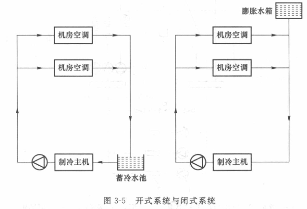 精密空調(diào)水系統(tǒng)均為循環(huán)式系統(tǒng)。如圖3-5所示,根據(jù)情況不同,可以分為開式系統(tǒng)和閉式系統(tǒng)。開式系統(tǒng)的回水進(jìn)入蓄水池,經(jīng)水泵輸送,其管路與大氣相通,循環(huán)水中含氧量高,管道和設(shè)備腐蝕較嚴(yán)重。空氣中的污染物,如塵土、雜物、細(xì)菌、可溶性氣體等,易進(jìn)入水循環(huán),使微生物大量繁殖,形成生物污泥,管路容易堵塞。當(dāng)末端設(shè)備與冷凍站落差較大時(shí),水泵則須克服落差造成的靜水壓力,會(huì)增加耗電量,水泵啟停也容易產(chǎn)生水錘現(xiàn)象。一般較少采用。