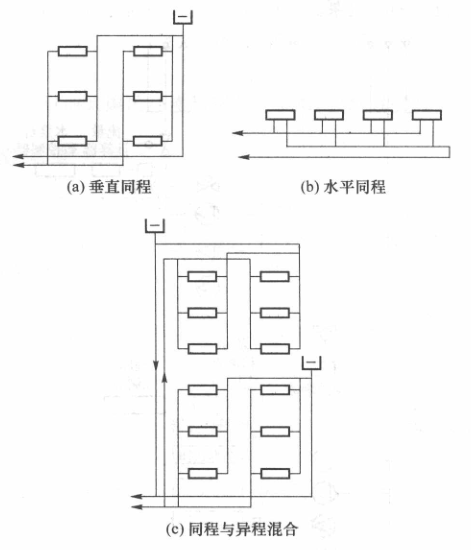 水系統(tǒng)的回水管布置分為同程式和異程式兩種,如圖3-11所示。同程式水系統(tǒng)中,各個機組環(huán)路的管路總長度基本相同,各環(huán)路的水阻力大致相等,故系統(tǒng)的水力穩(wěn)定性好,流量分配均勻。異程式回水方式的優(yōu)點是管路配置簡單,管材省。由于各環(huán)路的管路總長度不相等,故各環(huán)路的阻力不平衡,從而導(dǎo)致了流量分配不均的可能性。如果在水管設(shè)計時,和干管流速取小一些、阻力小一些,各并聯(lián)支管上安裝流量調(diào)節(jié)裝置,增大并聯(lián)支管的阻力,則異程布置水系統(tǒng)的流量不均勻分配程度可以得到改善。通常,水系統(tǒng)立管或水平干管距離較長時,采用同程式布置。建筑層數(shù)較少,水系統(tǒng)較小時,可采用異程式布置,但所有支管上均應(yīng)裝設(shè)流量調(diào)節(jié)閥以平衡阻力。