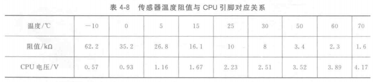 美的空調器的環溫和管溫傳感器均使用25 ℃/10kΩ型,傳感器在25℃時阻值為10kΩ,在15℃時阻值為16. 1 kΩ,傳感器溫度限值與CPU引腳對應關系見表4-8。