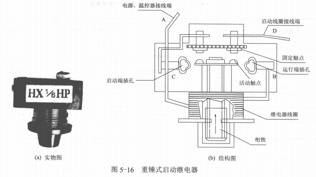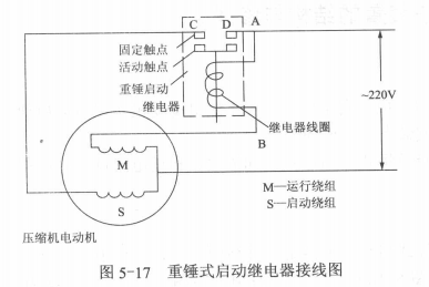 重錘式啟動繼電器工作原理:啟動繼電器的線圈和壓縮機(jī)電動機(jī)的運(yùn)行繞組串聯(lián)在起,如圖5-17所示。