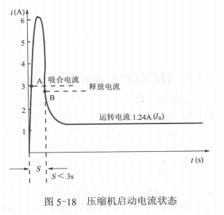 在壓縮機(jī)電動機(jī)接通電源的瞬間,由于只有運(yùn)行繞組接入,電動機(jī)無法起動,此時(shí)有較大的啟動電流。該電流值超過了“A”點(diǎn)繼電器的吸合電流,街鐵被吸上,銜鐵帶動動觸點(diǎn)向上運(yùn)動與靜觸點(diǎn)閉合,接通啟動繞組電源,在定子中產(chǎn)生旋轉(zhuǎn)磁場,使轉(zhuǎn)子轉(zhuǎn)動。而運(yùn)行繞組中的電流隨著電動機(jī)轉(zhuǎn)速的升高而下降,當(dāng)電動機(jī)轉(zhuǎn)速達(dá)到額定轉(zhuǎn)速的80%(約1s)時(shí),運(yùn)行繞組中的電流下降到“B”點(diǎn)繼電器的釋放電流值以下,繼電器線圖產(chǎn)生的電磁吸力無法吸住銜鐵,在自身重力的作用下,銜鐵下落使觸點(diǎn)斷開,從電路中斷開啟動繞組。此時(shí),啟動繼電器線圈中雖然通過額定電流,但不足以吸動銜鐵。