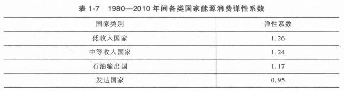 一般來(lái)說(shuō),工業(yè)發(fā)達(dá)國(guó)家,能源消費(fèi)彈性系數(shù)小于1,發(fā)展中國(guó)家能源消費(fèi)彈性系數(shù)大于1。表1-7為1980~2010年間各類(lèi)國(guó)家能源消費(fèi)彈性系數(shù)。
