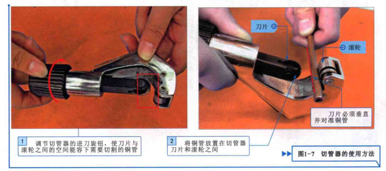 使用切管器切割管路是,通常先調整切管器,然后根據實際情況切割管路,具體的使用方法如圖1-7所示。