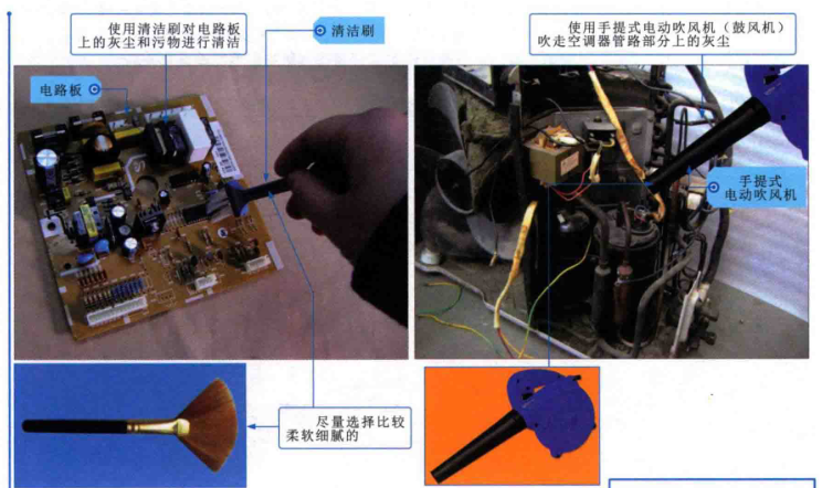 清潔工具是制冷產品維修人員在維修操作中非常重要的工具之一,若制冷產品中灰塵過多,電路板臟污嚴重時,可使用清潔工具進行操作,常見的清潔工具主要有清潔刷、吹風機等,下圖為清潔工具的使用方法圖解。