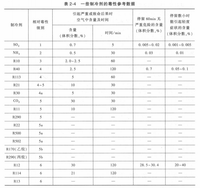 為了防止制冷劑對人體的侵害,應該使機房內空氣中制冷劑的含量不要超過允許的限度,這一限度大致如下:氨為0.02g/m3,碳氫化合物為30~40g/m3,各種氟利昂為100~700g/m3(按它的毒性級別而定)。