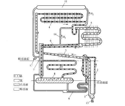 從冷凝器排出的氨液經U型液封供液管流至蒸發器5入口。U型液封可防止冷凝器中的高壓氨壯氣進入蒸發器。在蒸發器入口處,氨冷凝液與來自回氧管(位于平衡管14右側)的氫氣混合進入蒸發器。蒸發器中氨氧混合氣體的壓力雖很高,但氨的分壓力很低,氨液在低分壓下沸騰汽化制冷。可見,氧氣的加入,可使氨的分壓力突然降低,還起到了類似節流的作用。從蒸發器流出的低溫氨氧滋合氣體經氣相熱交換器6的外套管和氣液熱交換器7的內管,先后吸收氧氣和稀溶液的熱量后,流入貯液器8的上部,然后從吸收器的下部入口進入吸收器上行。其中的氨蒸氣則為在吸收器中下行的稀溶液所吸收,使溶液變濃后隨濃溶液流至貯液器,并經濟液熱交換器返回,發生器再次受熱汽化為氨蒸氣,完成制冷劑氨的循環。從貯液器進入吸收器的氨氫混合氣體,在氨被吸收的同時,氧氣卻因不參與吸收過程而分離出來,并由于氧氣的容重小和不斷受熱,將繼續在吸收器中上行,再經氣液熱交換器7、氣相熱交換器6和蒸發器入口與氨液混合,完成氧氣的循環。