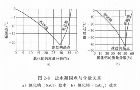 鹽水的性質與溶液中的鹽量多少有關。鹽水的凝固點取決于鹽水的含量,圖2-8中的a和b圖分別表示氯化鈉鹽水和氯化鈣鹽水的凝固點與含量關系。圖線中左邊曲線表示出隨鹽水的含量增加,鹽水的凝固點就降低,一直到冰鹽共晶點為止,此點相當于全部鹽水凍結成一塊冰鹽結晶體,冰鹽共晶點是最低的冰點,如果鹽水的含量不變,而溫度降低.低于該含盆所對應的冰點時,則有冰從鹽水中析出,所以共晶點左面的曲線就是析冰線。由此可見,當鹽水含量一定時,其凝固點的溫度也是一定的,在一定范圍內,含量增加,冰點降低。當含量超過共晶點時,就會有結晶鹽從鹽溶液中析出而冰點升高,所以冰鹽共晶點右面的曲線又稱析鹽線。不同的鹽水溶液共晶點是不同的,如氯化鈉鹽水,質量分數為23.1%時,共晶點溫度為-21.2℃;氯化鈣鹽水,質量分數為29.9%時,其共晶點溫度為-55℃。所以我們在選擇鹽水溶液時,鹽的含量一定要適中。過大和過小都是不利的。一般情況是使鹽水凝固點比系統中制冷劑蒸發溫度低4~8℃。