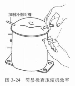檢查壓縮機效率 若加制冷劑無效,可將制冷劑抽出(另用壓縮機抽),割斷泵殼上的吸排氣管,然后接電源運轉,用手指按住排氣管讓壓縮機壓氣。當壓氣至手指按不住時,再用手指按住吸氣管感覺有吸力,一般認為壓縮機是可以用的,如圖3-24所示。